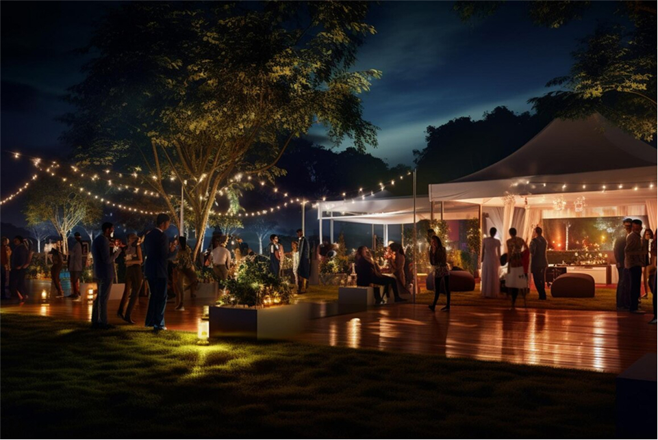 For outdoor celebrations, the Convertible Helipad & Cricket Ground offers an expansive 8,000 sq. ft. space that doubles as a cricket pitch, private helipad, or versatile event venue.